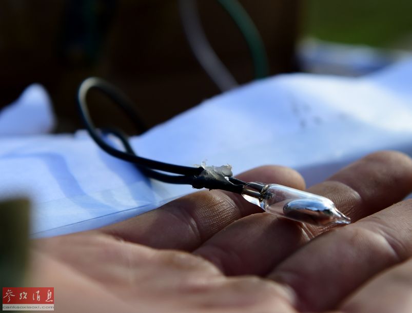 A soldier displays the mercury trigger device on a bomb, July 9, 2015. (Xinhua/Zhang Chenlin)
