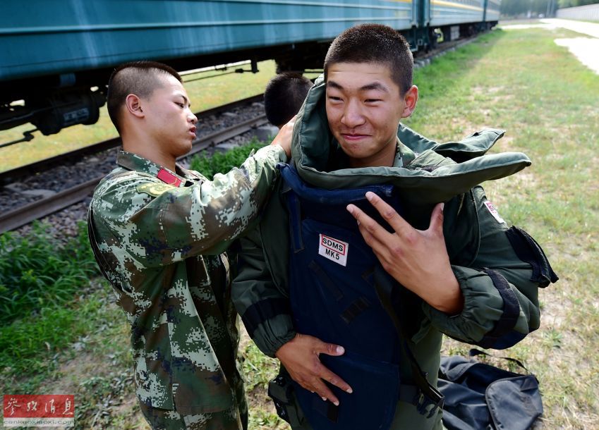 Soldiers put on EOD protective clothing, July 9, 2015. (Xinhua/Zhang Chenlin)