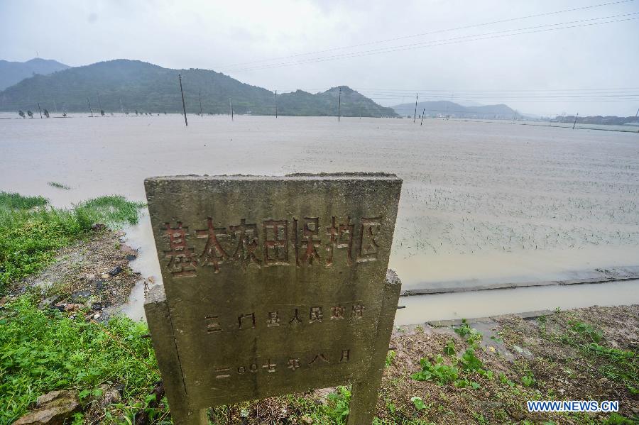 Photo taken on July 11, 2015 shows farmlands submerged by flood water in Qiantan Village, Sanmen County of east China's Zhejiang Province. The approaching Typhoon Chan-Hom has brought gales and rainstorms to Zhejiang Province, east China, forcing hundreds of flights to be canceled and highways to be closed, local authorities said Saturday. (Xinhua/Xu Yu)
