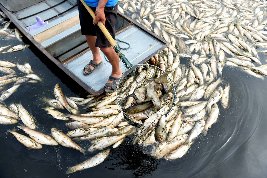 A fisherman drags dead fish out of the Tianjing Lake on July 6, 2015. An area of 61.3 square kilometers were seriously polluted which caused direct economic loss of 190 million yuan in local aquatic industry. (Xinhua Liu Junxi)