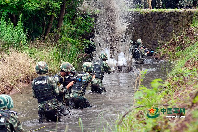 54 special operations soldiers from Jiangsu armed police corps attend a field comprehensive drill in Nanjing on July 8, 2015. They successfully completed a series of training subjects, such as 10 km long-range raid, rock climbing, rope descending and wading. (Photo/www.81.cn) |