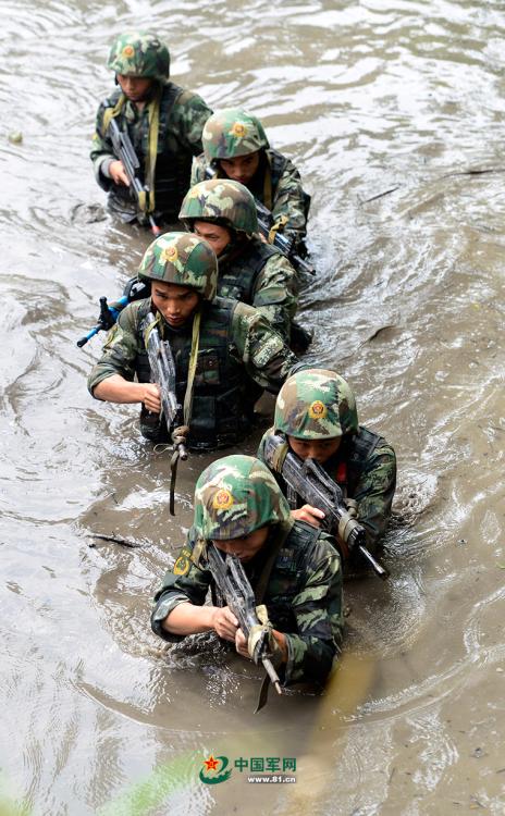 54 special operations soldiers from Jiangsu armed police corps attend a field comprehensive drill in Nanjing on July 8, 2015. They successfully completed a series of training subjects, such as 10 km long-range raid, rock climbing, rope descending and wading. (Photo/www.81.cn) |