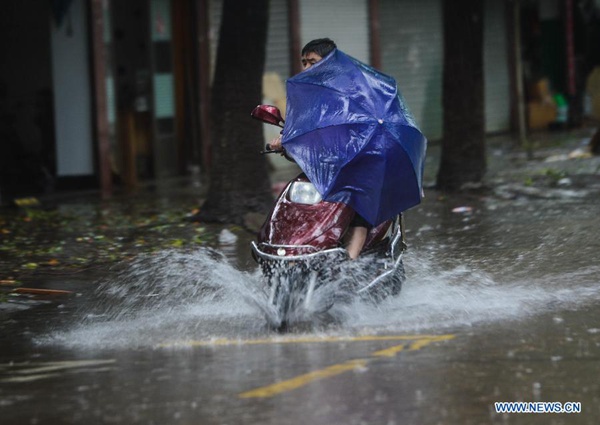 A man rides on a waterlogged road in Yuyao, east China's Zhejiang Province, July 11, 2015. Typhoon Chan-Hom, the ninth typhoon this year, landed at 4:40 p.m. in Zhujiajian Township of Putuo District in the island city of Zhoushan, packing winds of up to 45 meters per second, according to the provincial meteorological station. (Xinhua/Xu Yu) |