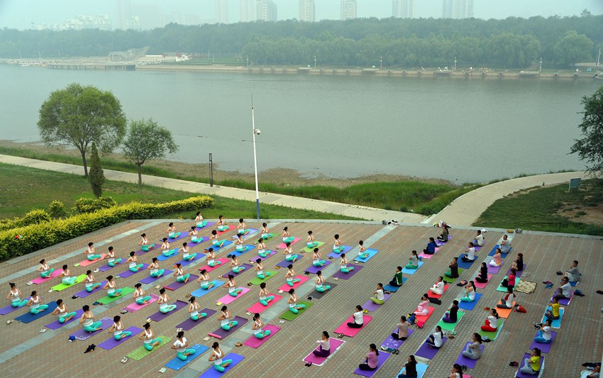 Enthusiasts practice yoga together in a scenic spot in Dezhou, Shandong province on July 8, 2015. Most of the participants are women from 10 to 60 years of age. (Xinhua/ Fang Changguo)