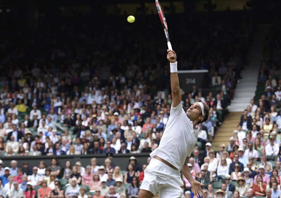 Roger Federer of Switzerland hits a shot during his Men's Singles Final match against Novak Djokovic of Serbia at the Wimbledon Tennis Championships in London, July 12, 2015. [Photo/Agencies]