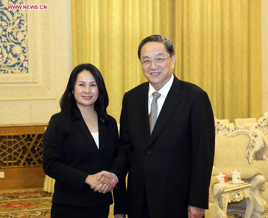 Yu Zhengsheng (R), chairman of the National Committee of the Chinese People's Political Consultative Conference, meets with a delegation of Taiwanese ethnic groups in Beijing, China, July 13, 2015. (Xinhua/Ding Lin)
