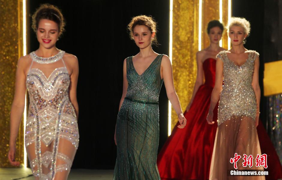 Foreign models display dozens wedding dress of new styles under the spectacular and romantic lighting at a wedding dress fashion show held at Shangri-La Hotel in Nanjing on July 12, 2015. (Chinanews/Yang Bo)