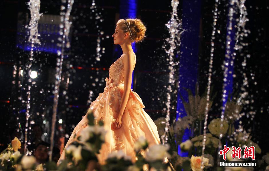 Foreign models display dozens wedding dress of new styles under the spectacular and romantic lighting at a wedding dress fashion show held at Shangri-La Hotel in Nanjing on July 12, 2015. (Chinanews/Yang Bo)