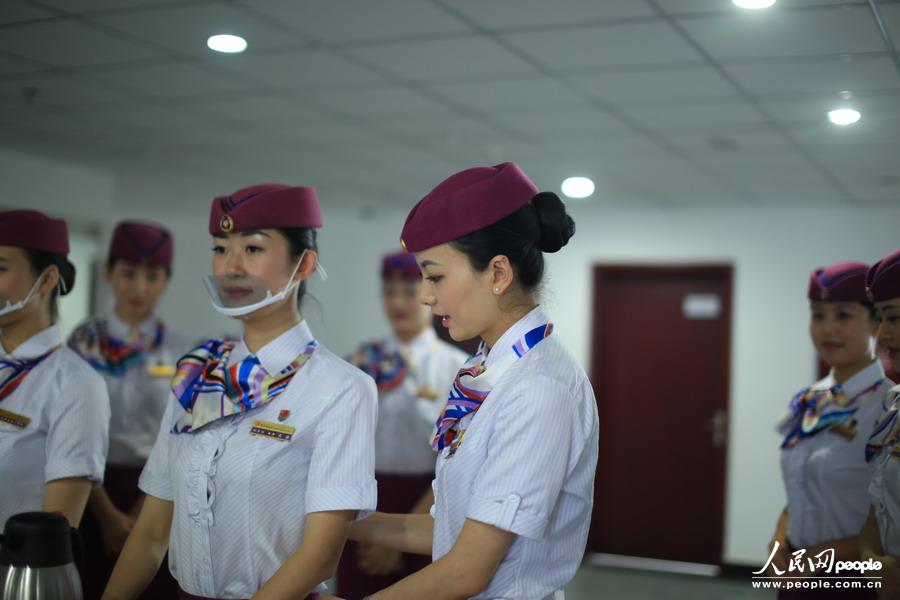 A group of stewardesses in Chongqing passenger service section of Chengdu Railway Bureau are in training on July 8, 2015. (Photo/people.cn)
