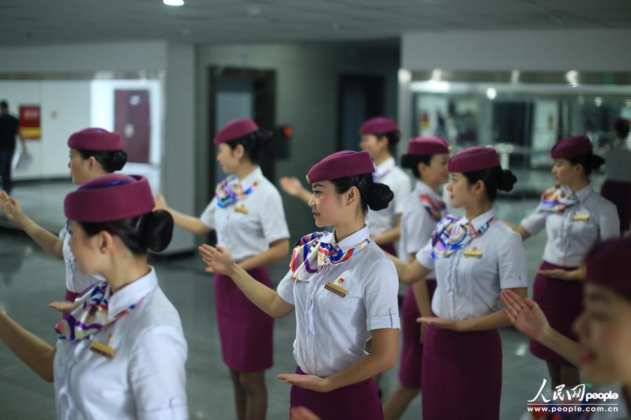 A group of stewardesses in Chongqing passenger service section of Chengdu Railway Bureau are in training on July 8, 2015. (Photo/people.cn)