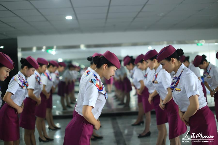 A group of stewardesses in Chongqing passenger service section of Chengdu Railway Bureau are in training on July 8, 2015. (Photo/people.cn)