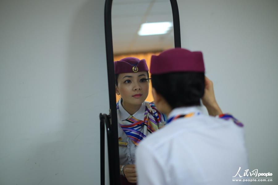 A group of stewardesses in Chongqing passenger service section of Chengdu Railway Bureau are in training on July 8, 2015. (Photo/people.cn)