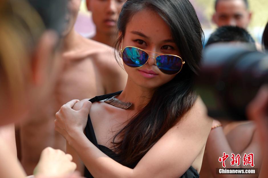 People show off their good figures in a park in southwest China's Chongqing last week. Some touched the bellybutton around the waist, some put coins or small gold fishes on the clavicle, which are the latest trend on Chinese social media for people to show off good figure. (Photo/CNS)