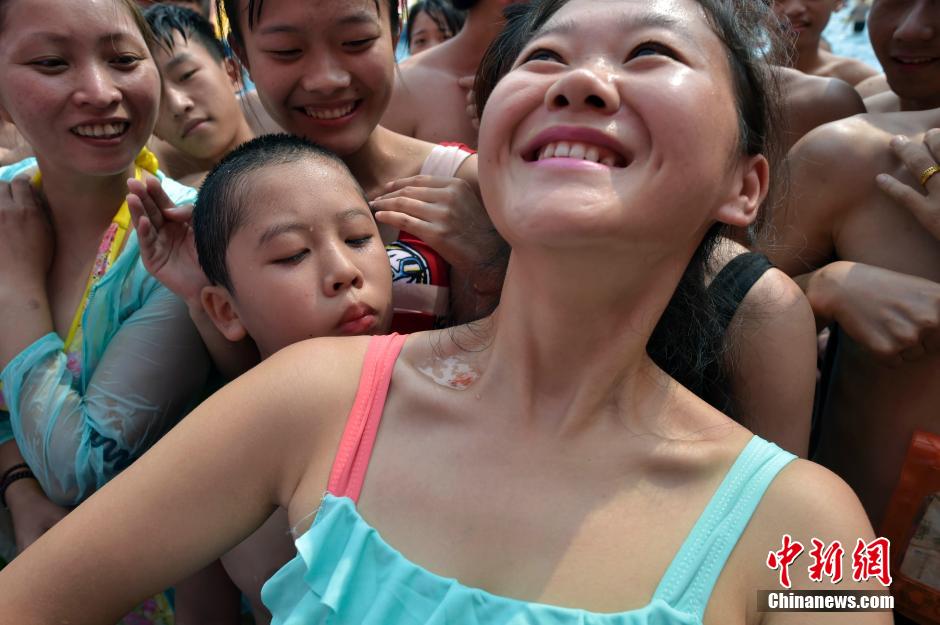 People show off their good figures in a park in southwest China's Chongqing last week. Some touched the bellybutton around the waist, some put coins or small gold fishes on the clavicle, which are the latest trend on Chinese social media for people to show off good figure. (Photo/CNS)