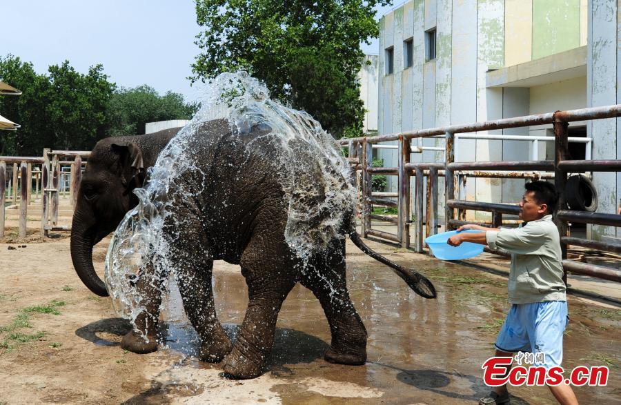 A zoo keeper sprays water on an elephant at a zoo in Ji’nan city, capital of East China’s Shandong province, July 13, 2015. Zoo keepers have tried numerous methods, such as providing water or watermelons, to help animals cope with the high temperatures that have reached 38 degrees Celsius. (Photo: China News Service/Zhang Yong) |