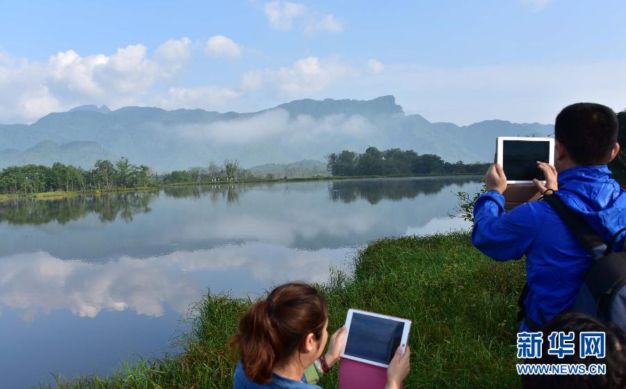 Tourists take photos in the Nine Lakes on July 13, 2015. (Xinhua/Du Huaju)