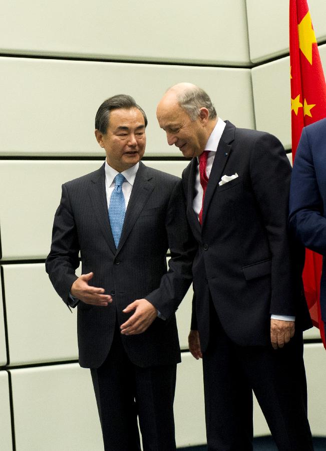 Chinese Foreign Minister Wang Yi talks with French Foreign Minister Laurent Fabius after a plenary session of foreign ministers in Vienna, Austria, July 14, 2015. Iran and six world major countries have adopted an agreement on the Iranian nuclear issue, European Union (EU) foreign policy chief Federica Mogherini formally announced here on Tuesday. (Xinhua/Qian Yi) |