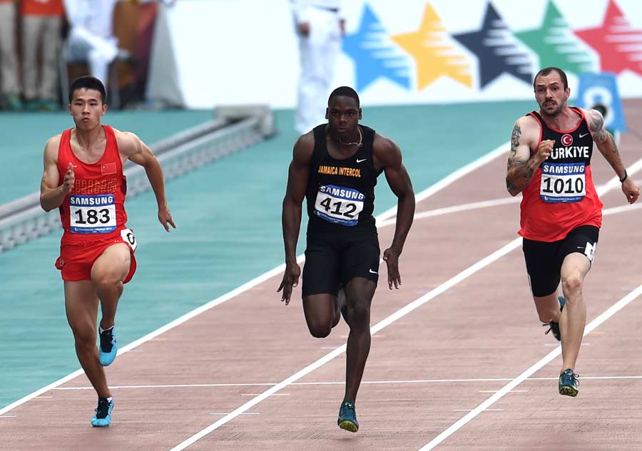 Yang Yang, left, competes in the men's 100 meters final, July 9, 2015. He finished eighth. [Photo/Xinhua]