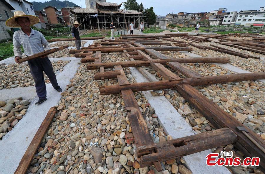 Workers reassemble a historic house donated by Hong Kong action film superstar Jackie Chan in Changting county, East China’s Fujian province, July 14, 2015.