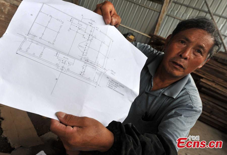 A man looks at a design to reassemble an historic house donated by Hong Kong action film superstar Jackie Chan in Changting county, East China’s Fujian province, July 14, 2015.