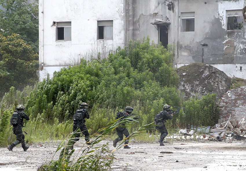 A detachment of Shanghai Armed Police Corps conducts an anti-terrorism exercise in Shanghai's Pudong District earlier in this month. The drill aims to improve the special armed police’s ability to handle emergency under full-time, all-weather, all-terrain circumstance. (Photo/ Xinhua)
