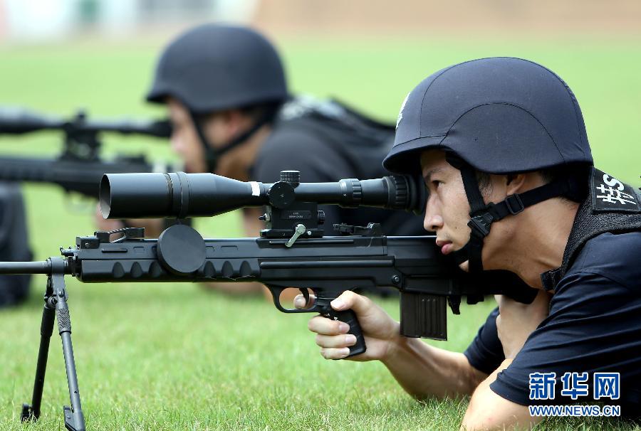 The SWAT team of Fengxian District Branch, Shanghai Municipal Public Security Bureau trains on July 14, 2015. (Xinhua/Fan Jun)