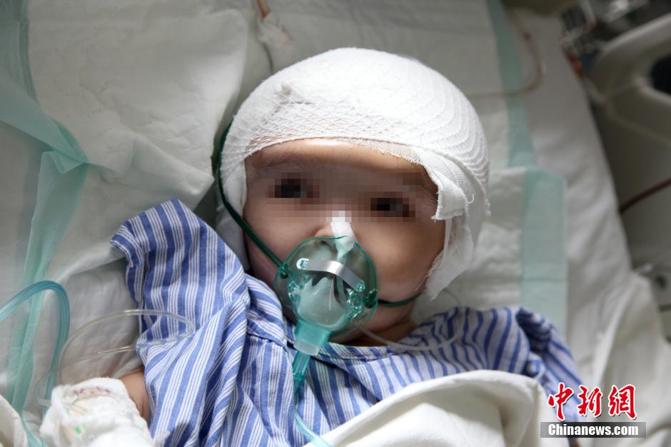 After 17 hours of effort, doctors successfully completed a skull transplant surgery on three-year-old Hanhan, who is called the big-head baby, in the Second People's Hospital of central China's Hunan province on July 15, 2015. The girls' new skull was printed by 3D printers. This is also the world's first case of such surgery.(CNS Photo) |