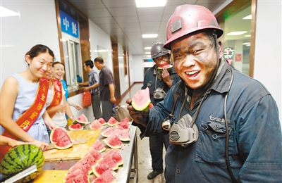 Miners just coming up from the mine eat watermelons on July 13, 2015