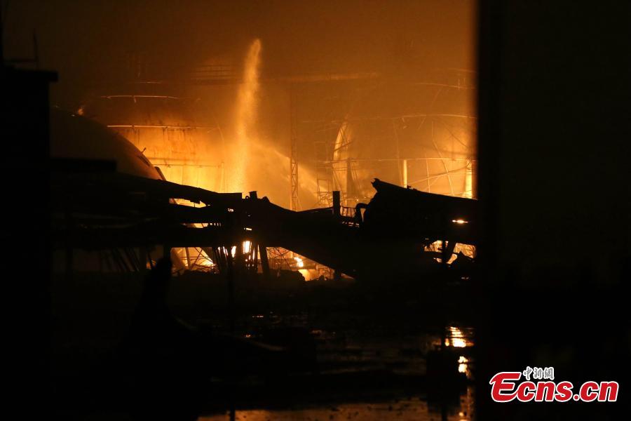 A fire breaks out when tanks containing liquefied hydrocarbon gas leak at a petrochemical plant in Rizhao, East China's Shandong province, on July 16, 2015. The blaze broke out at about 7:40 am when tanks containing liquefied hydrocarbon leaked at the plant in the city of Rizhao. More than 130 firefighters went to the scene. (Photo: China News Service/ Liang Ben)