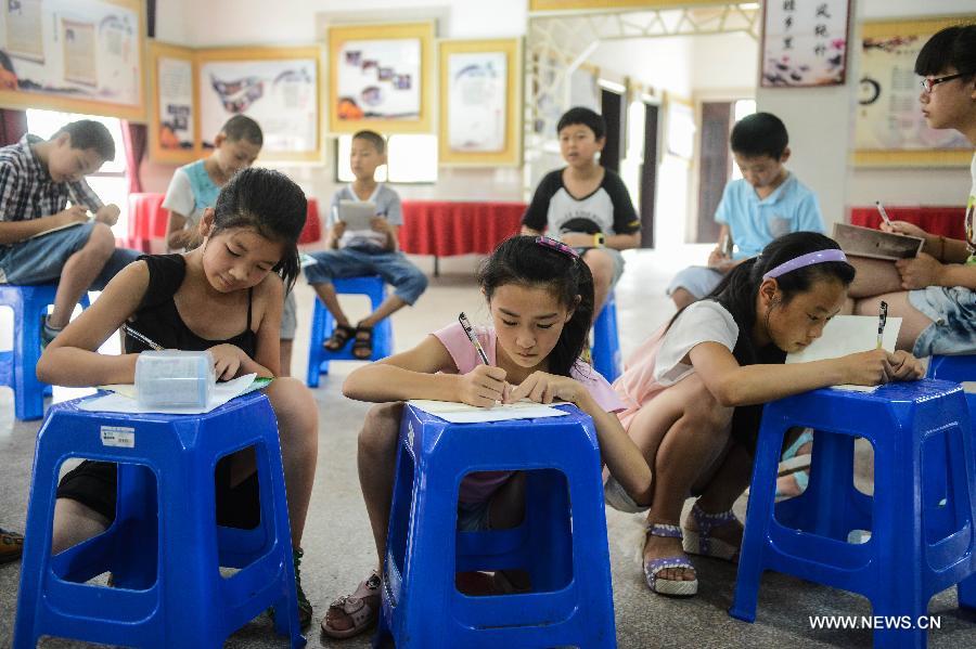 Left-behind children of migrant workers take part in a game in Xinyuan Village under Meishan Town of Changxing County, east China's Zhejiang Province, July 16, 2015. Summer programs including academic tutoring, group activities and arts training were held for left-behind children of migrant workers in the county. (Xinhua/Xu Yu)