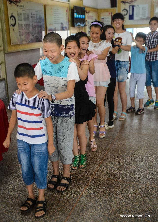 Left-behind children of migrant workers take part in a game in Xinyuan Village under Meishan Town of Changxing County, east China's Zhejiang Province, July 16, 2015. Summer programs including academic tutoring, group activities and arts training were held for left-behind children of migrant workers in the county. (Xinhua/Xu Yu)