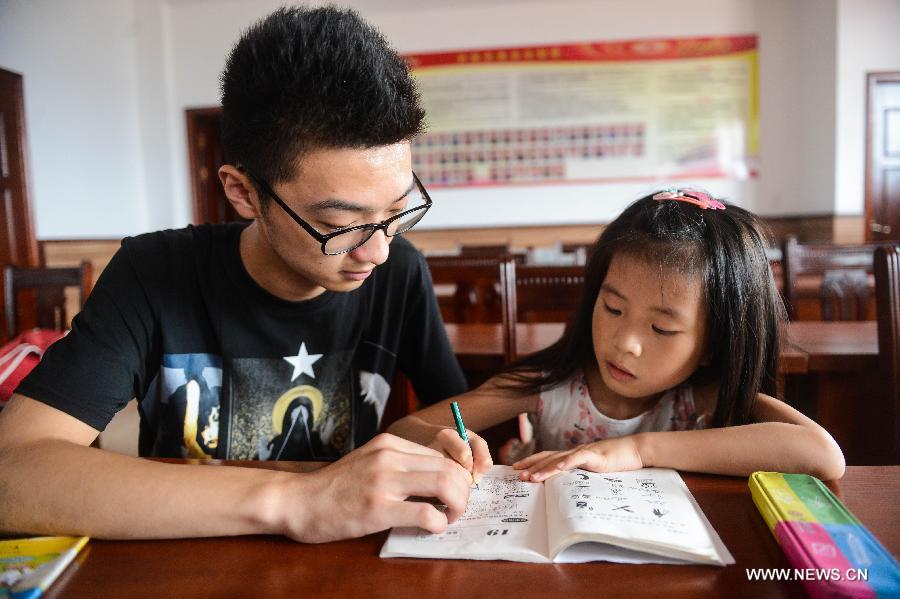 A volunteer helps a girl with her school work in Xinyuan Village under Meishan Town of Changxing County, east China's Zhejiang Province, July 16, 2015. Summer programs including academic tutoring, group activities and arts training were held for left-behind children of migrant workers in the county. (Xinhua/Xu Yu) |