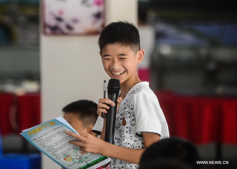 Left-behind children of migrant workers take part in a game in Xinyuan Village under Meishan Town of Changxing County, east China's Zhejiang Province, July 16, 2015. Summer programs including academic tutoring, group activities and arts training were held for left-behind children of migrant workers in the county. (Xinhua/Xu Yu) |