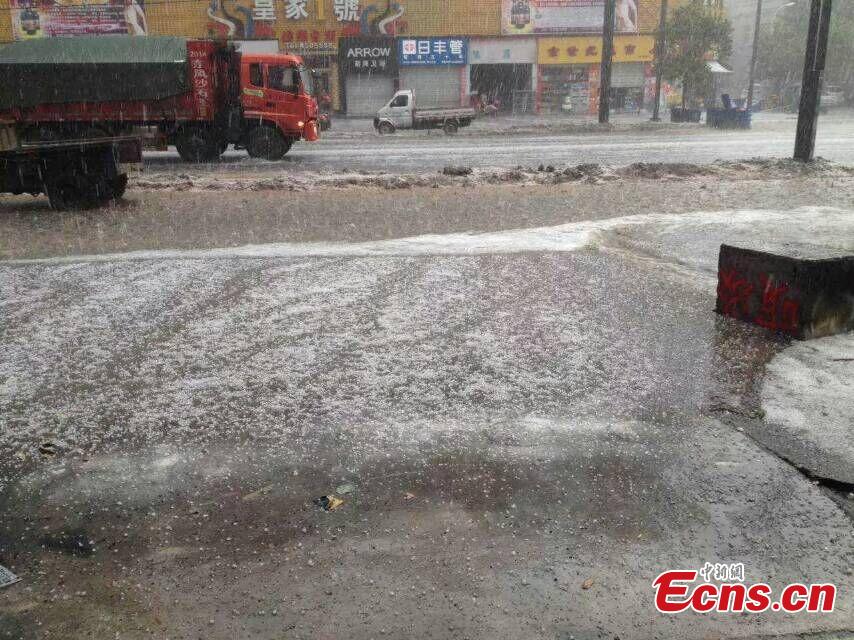 Hailstones fall in Wangcang county, Southwest China’s Sichuan province, July 16, 2015. The county was hit by rainstorms that brought hailstones, about 5 to 7 millimeters in diameter, on Thursday as local authorities issued an alert. (Photo provided to China News Service)