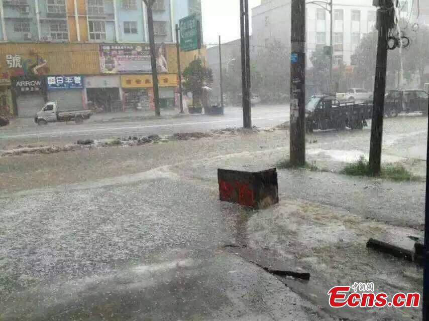 Hailstones fall in Wangcang county, Southwest China’s Sichuan province, July 16, 2015. The county was hit by rainstorms that brought hailstones, about 5 to 7 millimeters in diameter, on Thursday as local authorities issued an alert. (Photo provided to China News Service)