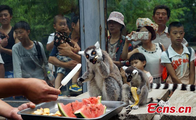 July 16th, Yantai, Shandong province, animals at Yantai nanshan zoo enjoy iced fruits to prevent sunstroke. (CNS photo/Ren yi)