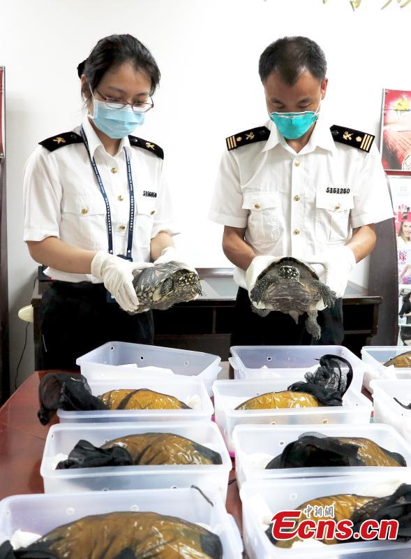Customs officers examine live turtles seized from a passenger at the Baiyun International Airport in Guangzhou city, capital of South China’s Guangdong province. A passenger was found carrying 247 Indian roofed turtles and 12 black pond turtles upon arrival in the airport against rules. (Photo: China News Service/ Liu Xihua)