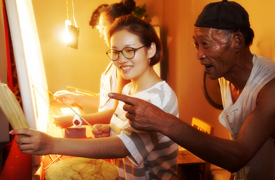 A Shaanxi folk artist demonstrateshow to accompany the show with a drum and gong.[Photo by Xu Jing/Chinaculture.org]