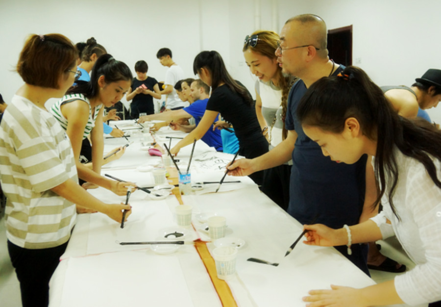 In the evening course, a Chinese teacher shows how to draw bamboo with a traditional Chinese brush and ink.[Photo by Xu Jing/Chinaculture.org]