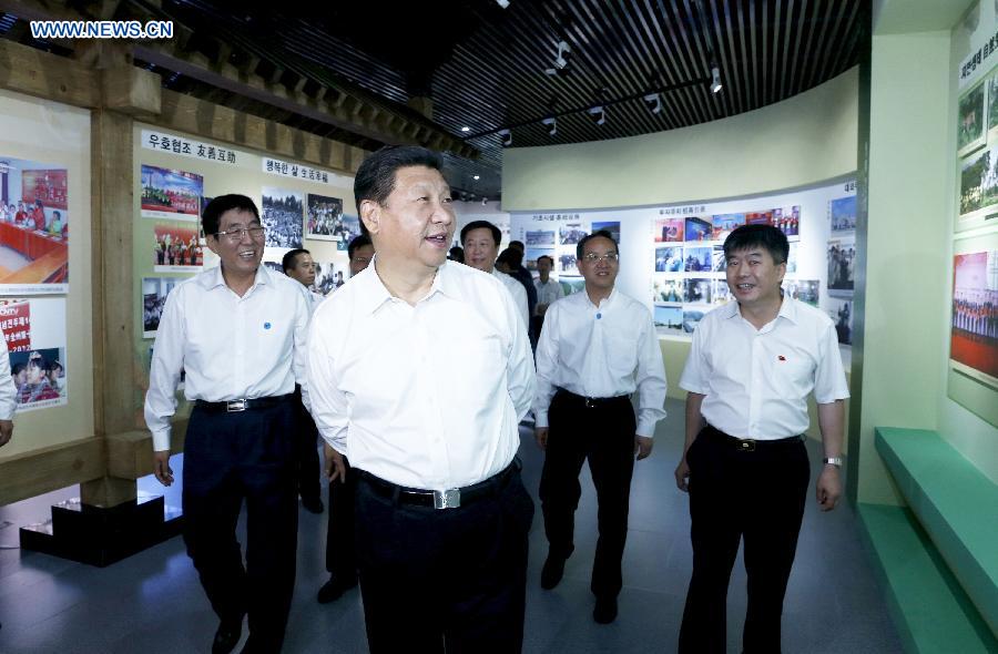 Chinese President Xi Jinping (front) visits an exhibition about the development of Yanbian in Yanbian Korea Autonomous Prefecture, northeast China's Jilin Province, July 16, 2015. Xi made an inspection tour in Jilin from July 16 to 18. (Xinhua/Ju Peng) |