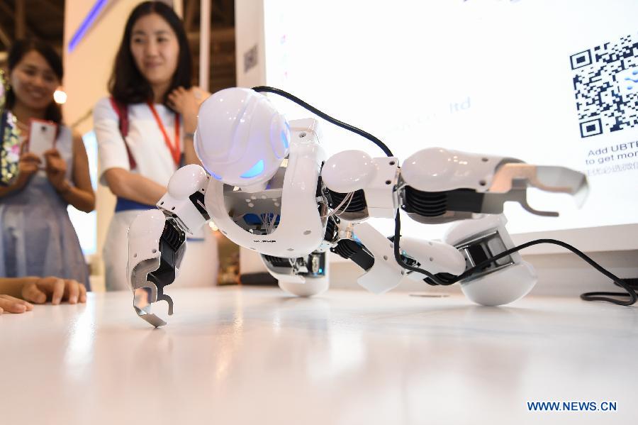 A robot performs push-ups with one hand for visitors at the International Expo Center where the 19th RoboCup is held in Hefei, capital of east China's Anhui Province, July 19, 2015. More than 2,000 participants from 47 countries and regions took part in the major and junior teams competitions. (Xinhua/Zhang Duan) |