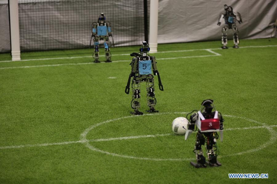 Robots play football during the 19th RoboCup in Hefei, capital of east China's Anhui Province, July 19, 2015. More than 2,000 participants from 47 countries and regions took part in the major and junior teams competitions. (Xinhua/Jin Liwang)