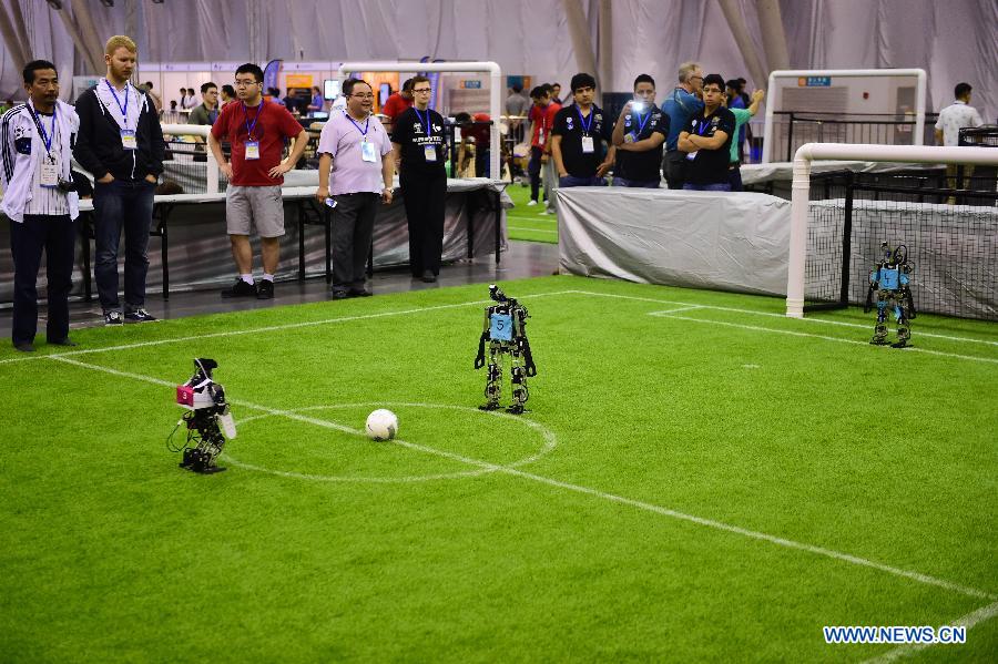 Robots play football during the 19th RoboCup in Hefei, capital of east China's Anhui Province, July 19, 2015. More than 2,000 participants from 47 countries and regions took part in the major and junior teams competitions. (Xinhua/Du Yu)