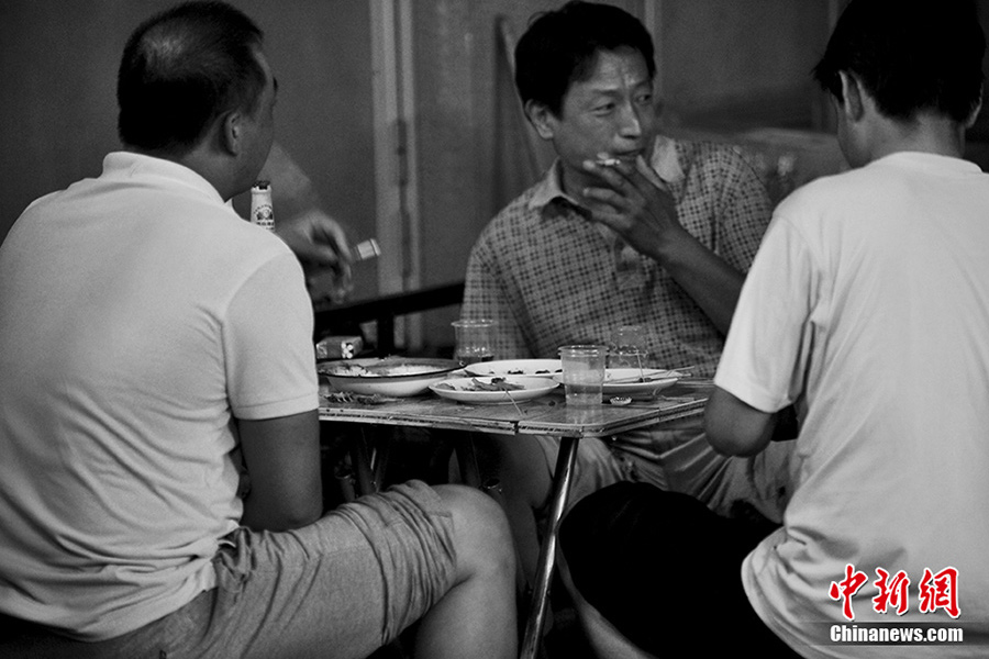 A man is drinking with his friends beside his small retail store in Houhai of Beijing. Eating and drinking, this is the happiest hour in the day.