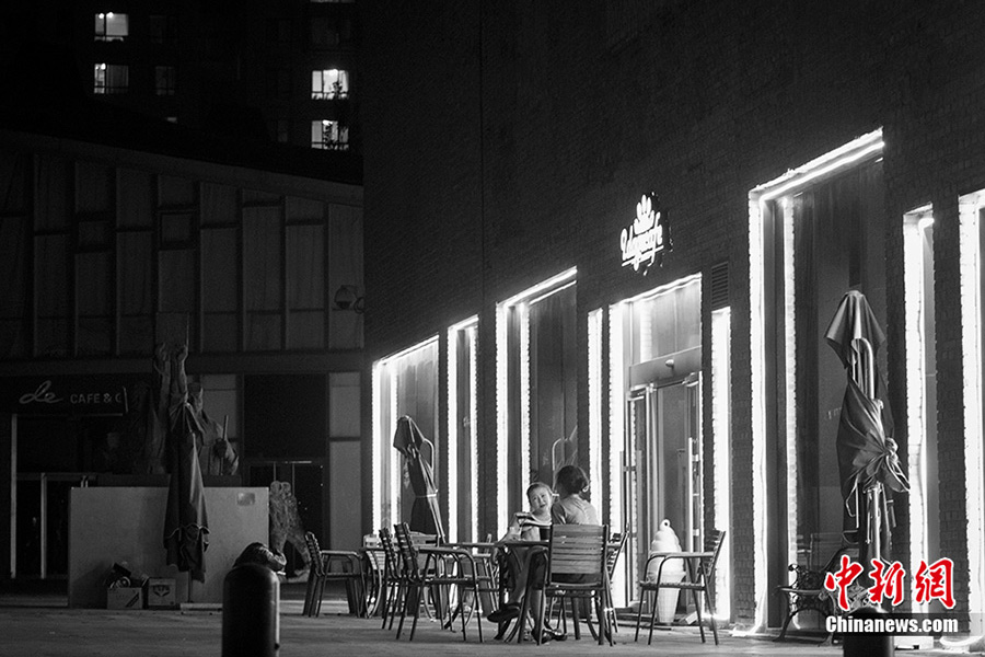 Two ladies are sitting outside a coffee shop and chatting at 11pm. After dinner most of people will go to next place for drinking and chatting.