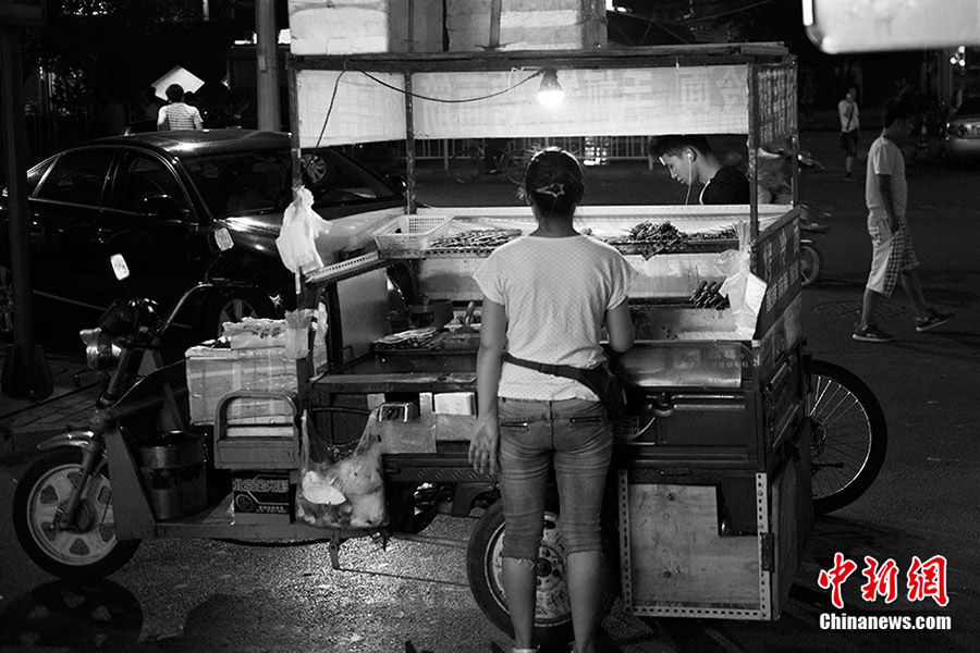 A vendor standing by a mobile stall transformed from a motor tricycle till midnight. She believes the smell of the food will make people to stop by.