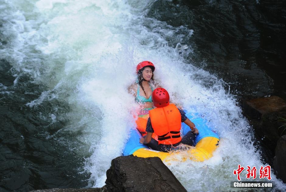 Charming bikini lifeguards appear in the river rafting place in Lianyunshan Mountain in Pingjiang, central China’s Hunan province on July 19, 2015. Those bikini girls sit with tourists in the same raft to protect their safety. (CNS/Yang Huafeng)
