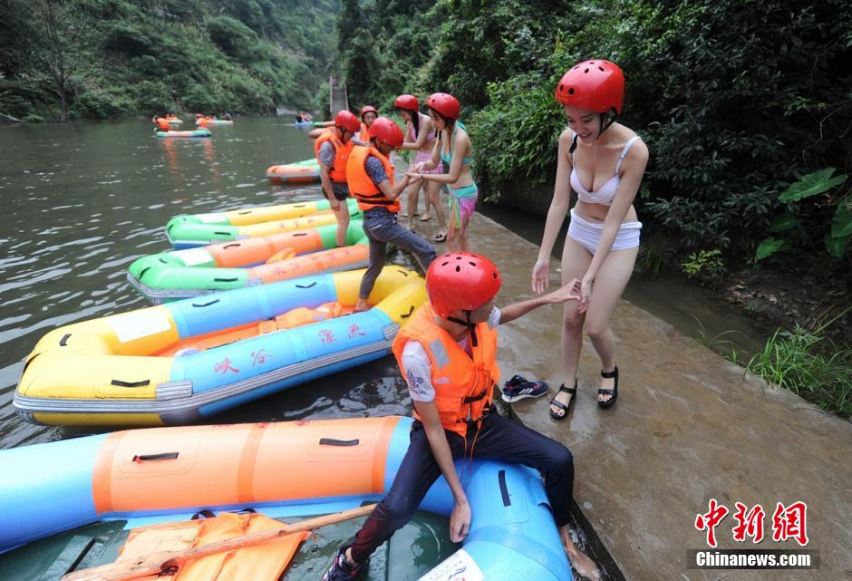 Charming bikini lifeguards appear in the river rafting place in Lianyunshan Mountain in Pingjiang, central China’s Hunan province on July 19, 2015. Those bikini girls sit with tourists in the same raft to protect their safety. (CNS/Yang Huafeng)