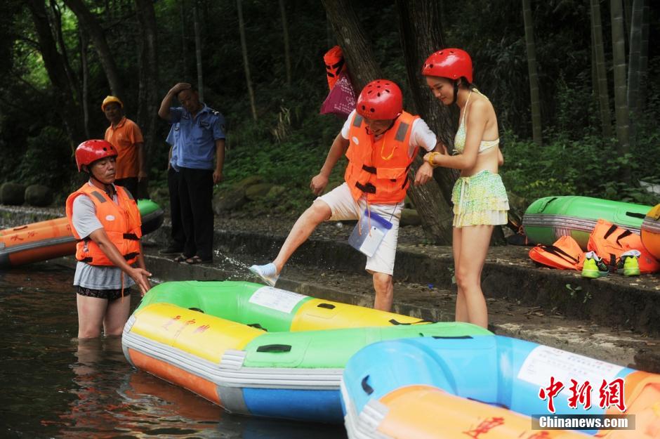 Charming bikini lifeguards appear in the river rafting place in Lianyunshan Mountain in Pingjiang, central China’s Hunan province on July 19, 2015. Those bikini girls sit with tourists in the same raft to protect their safety. (CNS/Yang Huafeng) |
