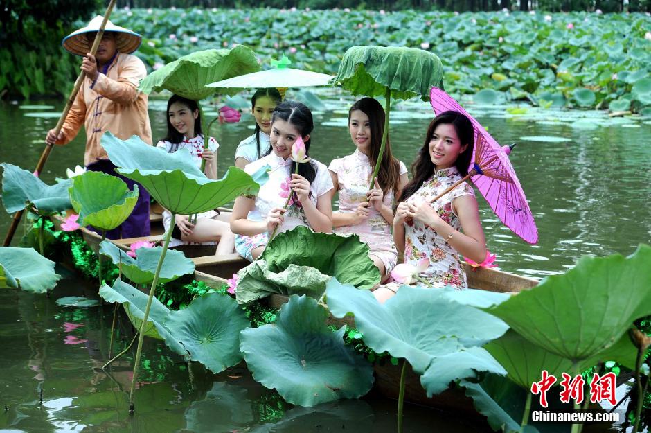 On July 19, top 10 candidates in cheongsam for 2015 Zhujiang image ambassador row boats in a lotus pond and seem like China’s “lotus fairy”. (CNS/Cui Yukun)